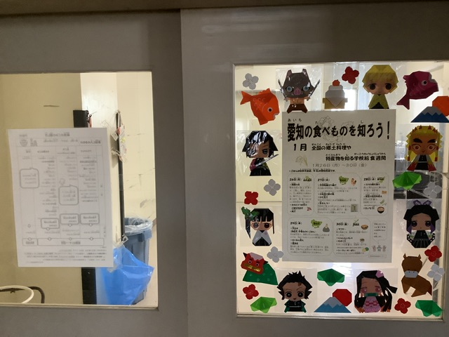 給食の配膳室に明るい掲示があります。一月は、鬼滅の刃のキャラクターなどなど。心が和む折り紙の作品です。給食職員の方の制作です。