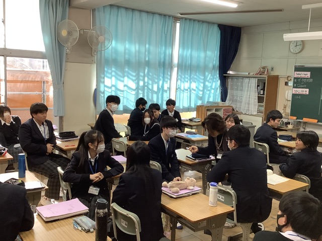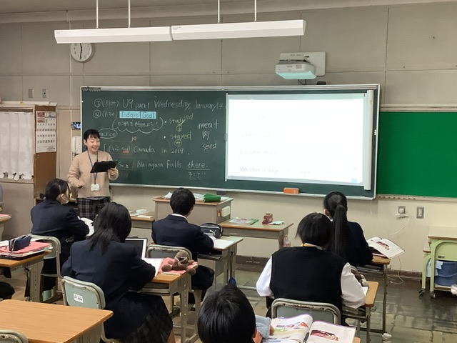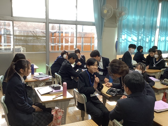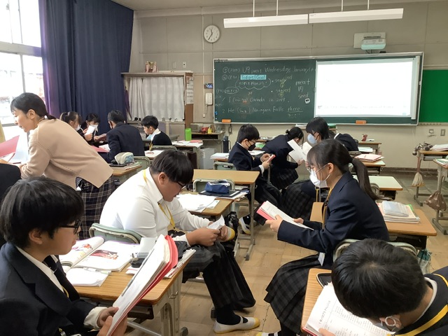 一年生の授業の様子です。英語では、ペアで活発にリーディングをしています。しっかり声を出して伝え合っています。
