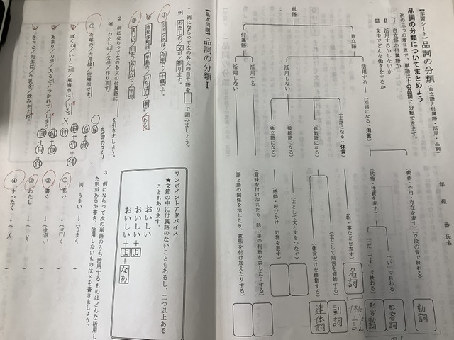 一年生の国語です。文法の学習に入りました。特製の「文法の達人」が一人一人に配布され、ポイントを押さえて学んでいく予定です。