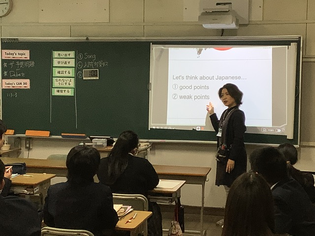三年生の英語です。日本と海外の国とを比べて、日本の良さと課題を出しました。ペアで考えたことを英語で表現しています。